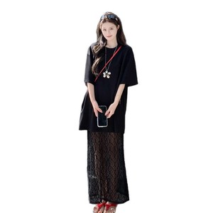 レースステッチ偽ツーピース白半袖Tシャツドレス女性の夏のデザインニッチ怠惰な休暇スタイルのロングスカート