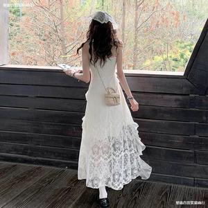 甜美风不规则吊带连衣裙女夏季木耳边钩花修身显瘦A字裙