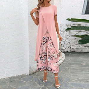 2025 ヨーロッパとアメリカの貿易 AliExpress 新しい女性のカジュアルプリント不規則なトップワイドレッグパンツスーツ