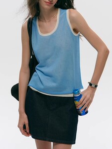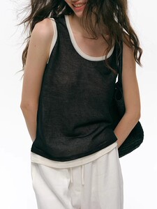 リネン混紡二重襟コントラストカラーベストサスペンダーレディース夏の新しい通気性の薄いノースリーブトップ