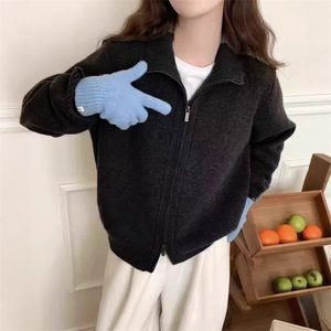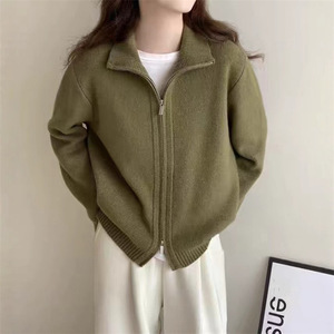 ファッショナブルなダブルジッパーニットカーディガン女性の秋と冬の新しい和風ルーズシンプルなラペルセータージャケットレイジートップ