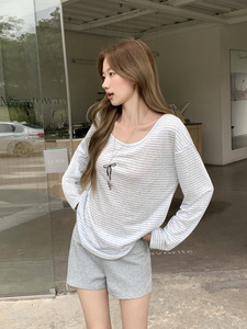 韓国スタイルのレイジースタイルストライプ U ネック日焼け止めブラウス長袖 Tシャツ女性のための 2025 夏の新しいユニークなニッチトップ