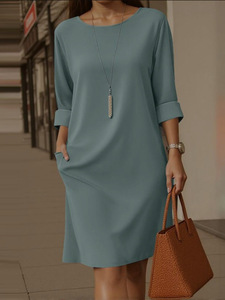 2025年新作ヨーロッパとアメリカのクロスボーダー気質エレガントなラウンドネック多用途ソリッドカラーサイドポケットミッドスリーブドレス