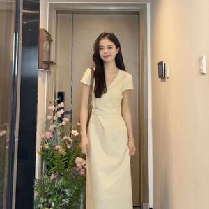 韩系简约设计感交叉绑带连衣裙女夏季新款收腰显长款茶歇裙子