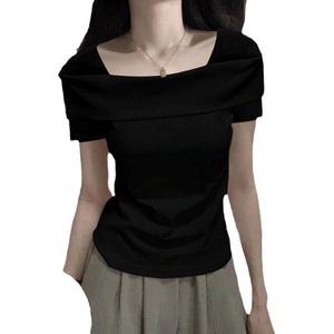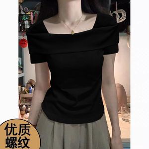フレンチ春夏薄底シャツ、タイトフィット、ワンショルダー、鎖骨露出、カジュアルでファッショナブルなレディース糸入り半袖