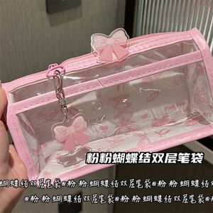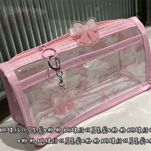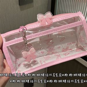 ピンクのリボン二層透明鉛筆バッグインスタイル高価値ガーリーハート透明大容量文具収納袋