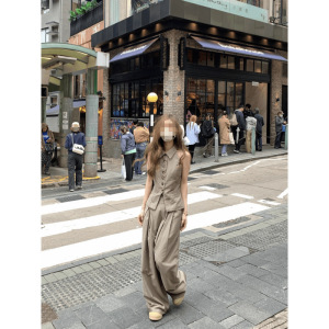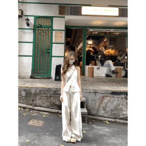 韓国夏痩身怠惰なスーツ肩ノースリーブベストトップ + カジュアルワイドレッグパンツツーピースセット