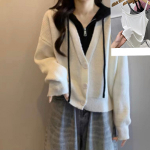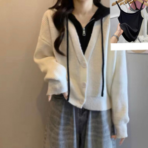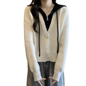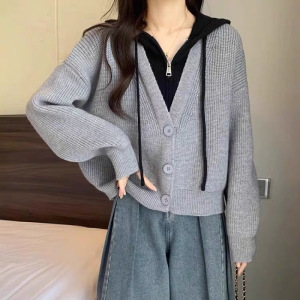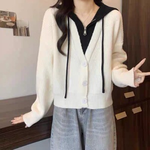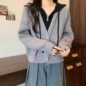 今年流行短款连帽毛衣外套女早秋大码胖显瘦假两件针织开衫上衣