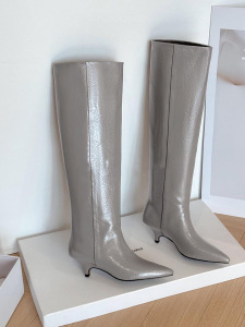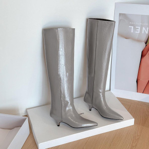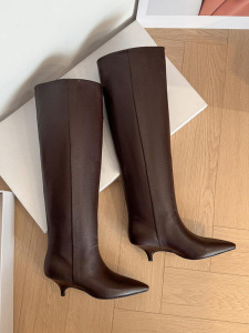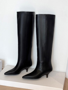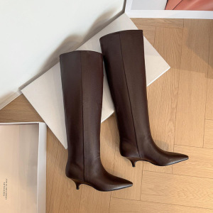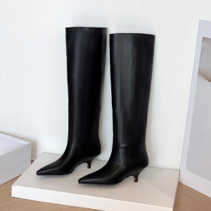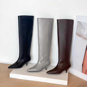 本革ミニマリストヨーロッパとアメリカンスタイルの女性用膝上ブーツ2025新しいレトロキャットヒールライト大人スタイルのブーツワイドチューブスリム