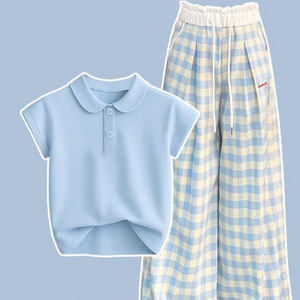 女子学生夏ワイドレッグチェック柄パンツセット 2025 ガールズカレッジポロ襟 Tシャツブルーカジュアルツーピーススーツ