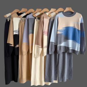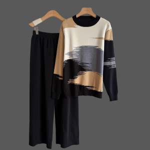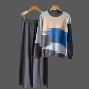 ヨーロッパとアメリカの西洋風油絵風ラウンドネックルーズ長袖セーターレディースルーズワイドレッグパンツ冬セーターツーピーススーツ