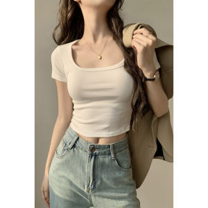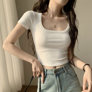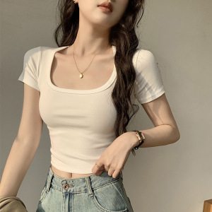 Gexifan ポジティブショルダースクエアカラー半袖 Tシャツレディース 2025 夏新作小柄ショートへそ出しホワイトトップトレンディ