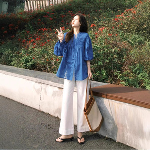 今年の夏に人気のユニークで美しいトップス、フレンチスタイル、超格好良い、年齢を軽減するクラインブルーのランタンスリーブシャツ