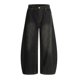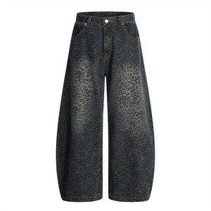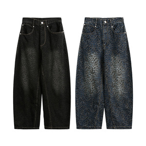 アメリカンレトロヒョウ柄シミタージーンズメンズハイストリートバイブトレンディウォッシュ加工ダメージシルエットルーズワイドレッグパンツ