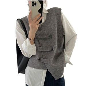 跨境针织马甲背心女春秋新款文艺风外穿不规则坎肩双排扣马甲开衫