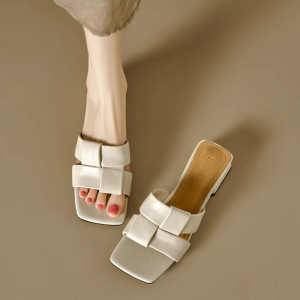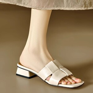 スポットグッズ!ジュジュジュは履きやすい〜本革の手編みサンダル、レディース夏アウター、太いヒールスクエアトゥサンダル