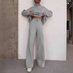 2025年クロスボーダーヨーロッパとアメリカの長袖ブラウン気質ワイドレッグパンツファッショナブルなルーズハイカラーカジュアルツーピーススウェットシャツ女性用