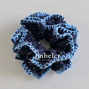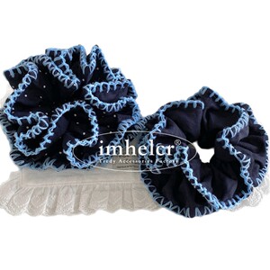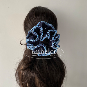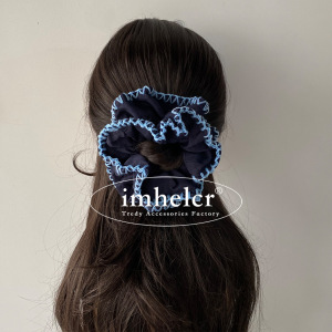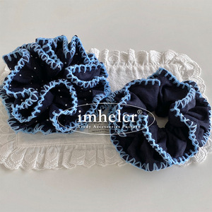 韓国重工業水玉ニットレースネイビーブルーのヘアゴム〜ニッチな雰囲気の女性用二層腸リングポニーテールヘアロープ