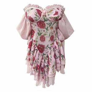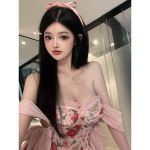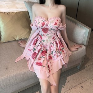 セクシーで甘いワンラインネックラインチューブトップ花柄妖精スカートファッショナブルなプリントウエスト痩身大きな裾ふわふわドレス