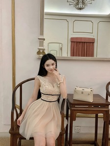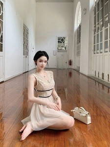 ホットドッグ ホットドッグはとてもスパイシーで、バレエのようなウエストを細くするレースステッチメッシュノースリーブドレス