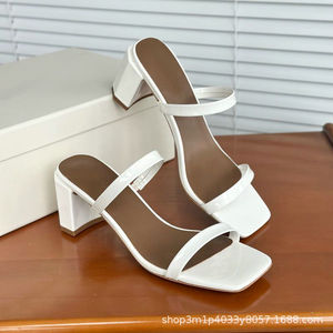 原单东莞货!夏新款真皮方头粗高跟一字带凉拖鞋百搭气质女凉鞋