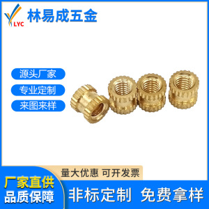 射出成形銅ナット、貫通穴付きローレット加工埋め込みナット、銅インレイ部品、銅ローレットナット、インレイ部品、ネジキャップ、黄銅、耐腐食性