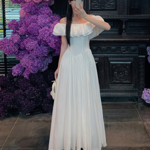 新款气质荷叶边显瘦飞飞袖a字裙连衣裙白长裙子女夏
