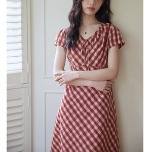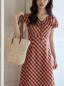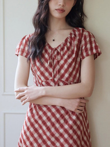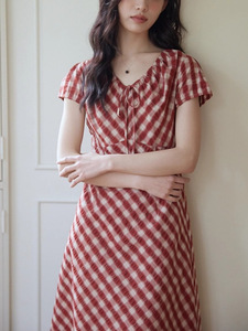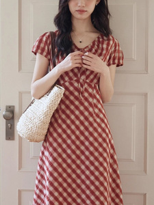 レトロなコントラストチェック柄の小さなフライングスリーブプリーツVネックドレス女性の夏休みウエスト痩身チェック柄スカート