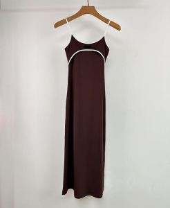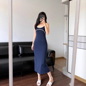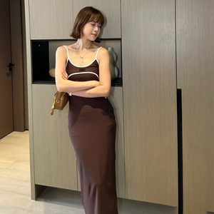 25サマーMの新しいセレブスタイルのシンプルで多用途なスリムフィットコントラストカラーエッジフェイクツーピースベストサスペンダーロングドレス