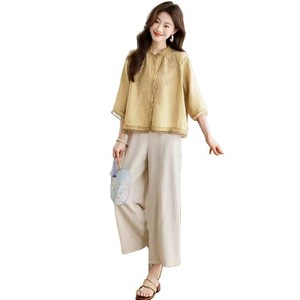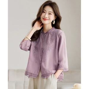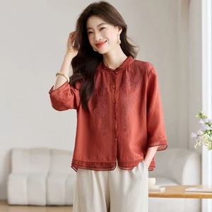 リアルショット中国風ファッショナブルなラミーシャツトップルーズ年齢軽減大きいサイズ中国風刺繍スタンドカラーシャツ