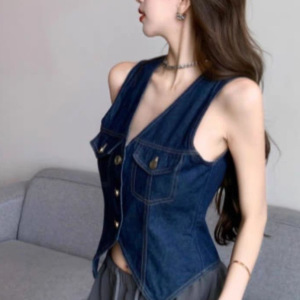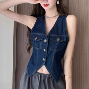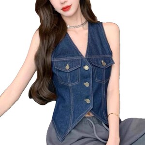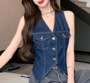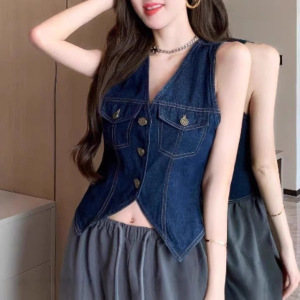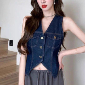 复古港风chic牛仔马甲背心女夏薄款纯欲V领无袖修身短款开衫上衣
