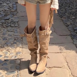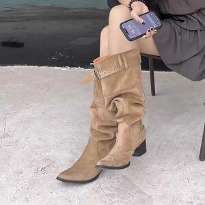 レトロメイラードブーツ、大きな筒、スリム、プリーツパイルブーツ、レディース夏用ポインテッドトゥ太ヒールカーキブーツ