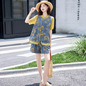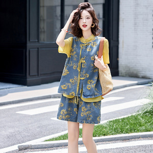 女性のためのカジュアルプリントデニムスーツ 2025 夏の新しいファッショナブルなスタイルの年齢を軽減するベストワイドレッグショーツ 3 点セット