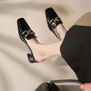 包頭ハーフスリッパ女性の夏の新しいスタイルのエクステリアパテントレザー多用途ミッドヒール厚いヒールスクエアトゥミュールサンダル