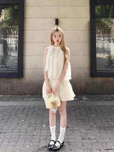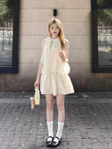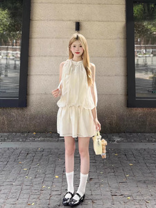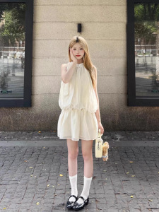 フレンチノースリーブホルターネックドレス女性のための 2025 夏の新しい白い気質チュール休暇美しいショートスカート