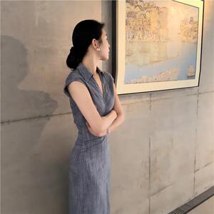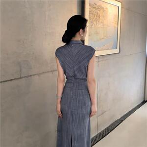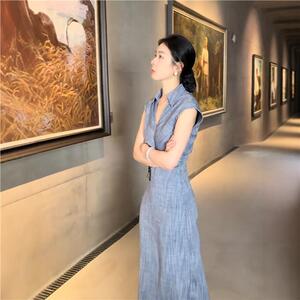 フレンチスタイルのVネックベストノースリーブドレス、女性用夏の新しいスタイル、ウエストを細くし、スリムで美しいAラインロングスカート、多用途
