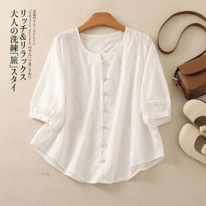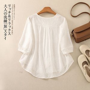 綿刺繍夏の新しいデザイン文学ラウンドネックルーズシャツ薄い白七分袖シャツ女性用