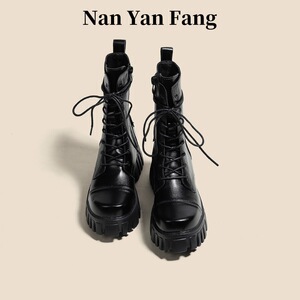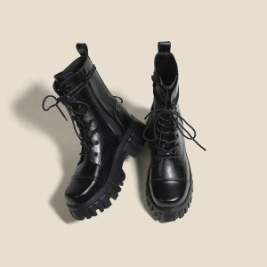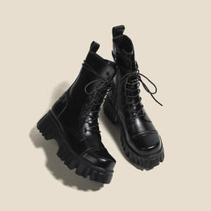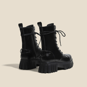 女性用ショートブーツ 2025 秋冬新作厚底厚底ヒールナイトミッドカーフブーツ黒小柄英国風マーティンブーツ