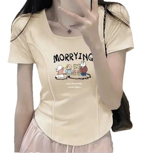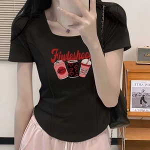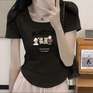 西洋風フィッシュボーン大きいサイズ半袖レディーススクエアカラーショートヨーロピアンスタイル甘い非対称カーブ痩身ニッチTシャツイントレンド