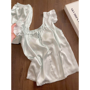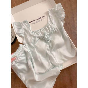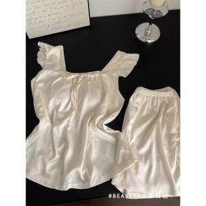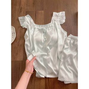 フレンチガールバタフライジャカードサテンアイスシルクパジャマ女性の夏の快適な胸パッド付き小さなフライングスリーブホームウェアセット