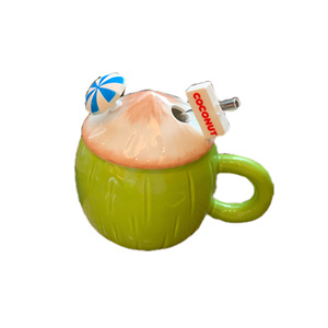クリエイティブでかわいいセラミックウォーターカップ、蓋とストロー付き、大容量のコーヒーミルクドリンクサマーココナッツマグ