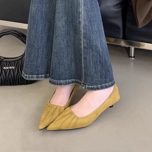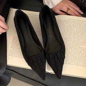 フレンチキトゥンヒールミッドハイヒールポインテッドトゥプリーツシューズ婦人靴2025夏気質スエードブラック通勤靴