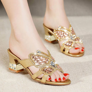 跨境粗跟女鞋凉拖2025新款镶钻高跟一字拖女夏季女士中跟水钻凉鞋