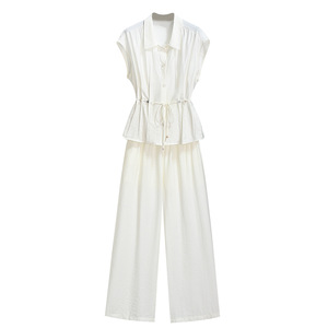 ユニークな美しい白いテンセルノースリーブシャツとワイドレッグパンツ女性のための 2025 夏の新しい気質ツーピースセット