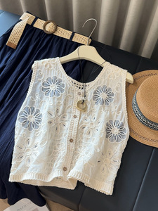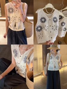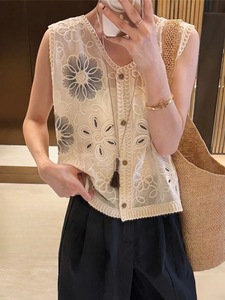 Vネック中空かぎ針編みノースリーブシャツ女性用2025夏新作フレンチデザイン外国風多用途痩身トップ