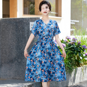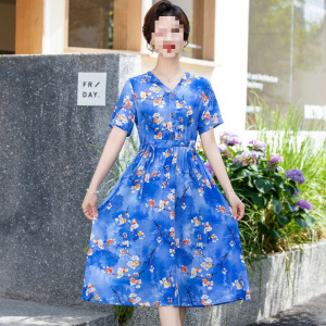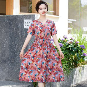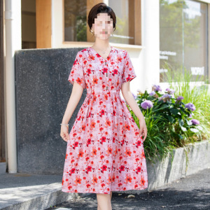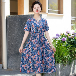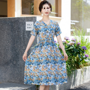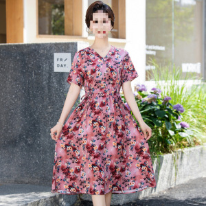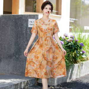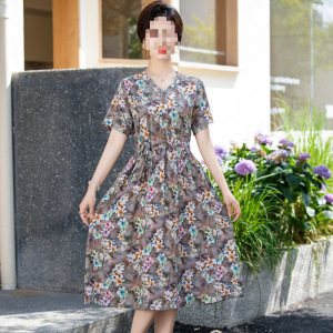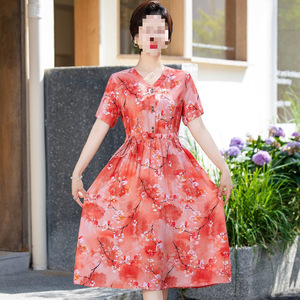 ポケット付き中年母親の花柄ドレス新しい膝上ロングドレス母親の高級綿シルクプリントドレス