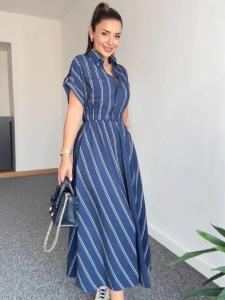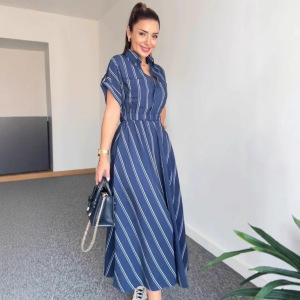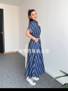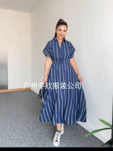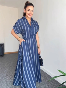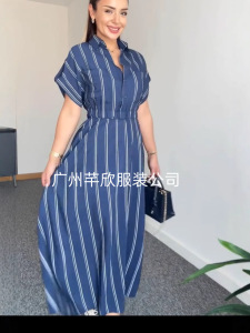 Amazonクロスボーダーヨーロッパとアメリカの女性用シャツカジュアルで多用途なストライプドレスポケットプリーツウエスト痩身ロングスカート