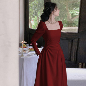 春と秋の女性用の赤い長袖ドレス、フランスの婚約式や結婚式のドレス、花嫁の乾杯ドレス、普段着のロングドレス
