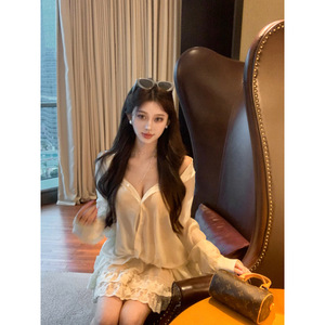 【ビンゴ】+シャヘ25春パール光沢シフォンエレガントイレギュラーシャツイレギュラーレーススカートスーツ