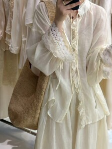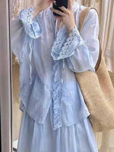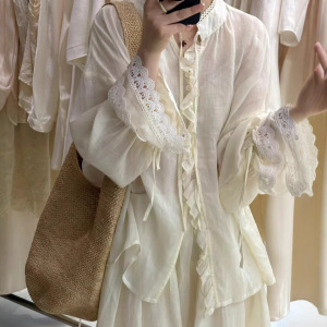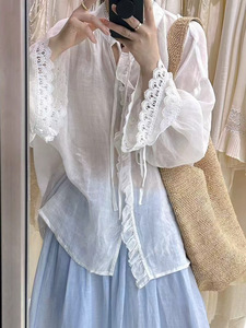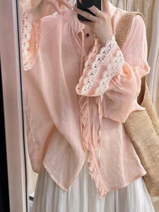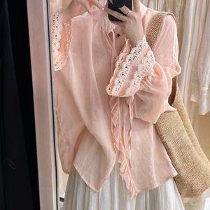 2025 夏デザインニッチレース V ネックレースアップシャツ女性のラミー甘いフレアスリーブトップ